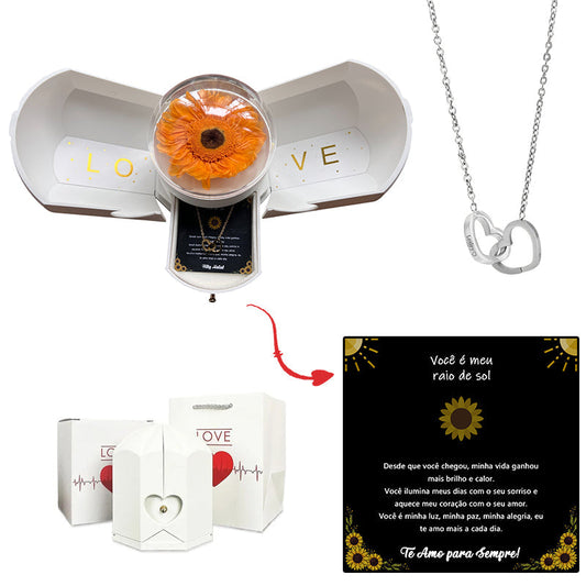 Caixa com Girassol Eterno & Colar Coração Personalizado